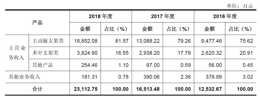 根据招股书披露的数据,公司主动脉支架类和术中支架类产品在2018年的平均销售单价分别为17,274.88元/条和5,575.65元/条。