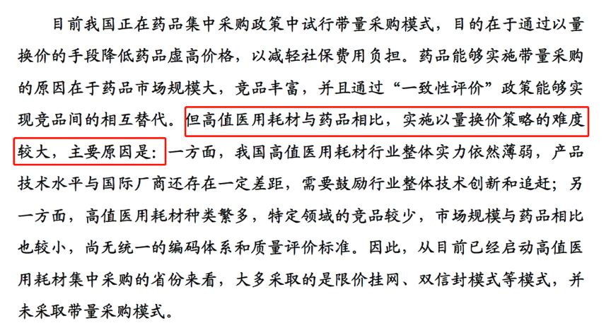 心脉医疗回复表示“与药品相比,高值医用耗材实施以量换价策略的难度较大,主要原因是国内高值医用耗材行业实力仍然薄弱,需要继续鼓励技术创新和追赶。同时,高值医用耗材种类繁多,特定领域竞品少、市场规模相比药品较小,而且尚无统一的编码体系和质量评价标准。”