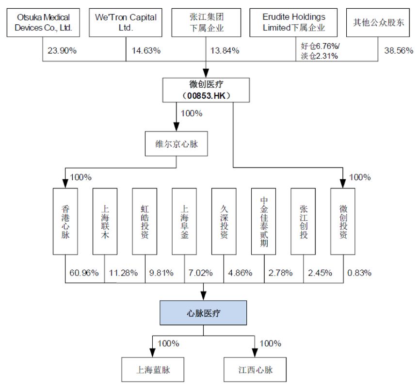 心脉医疗成立于2012年,是港股上市公司微创医疗(0853.HK)的控股子公司。截至2018年底,微创医疗通过香港心脉、微创投资合计持有公司61.79%的股权。此外,主要高管通过虹皓投资持有公司部分股权。