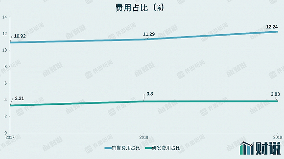 从极米历年费用来看,销售费用占比始终远高于研发费用占比,且增长速度更快。从2017年到2019年,公司销售费用占比从10.92%增长到12.24%,研发费用占比则从3.31%增至3.83%。