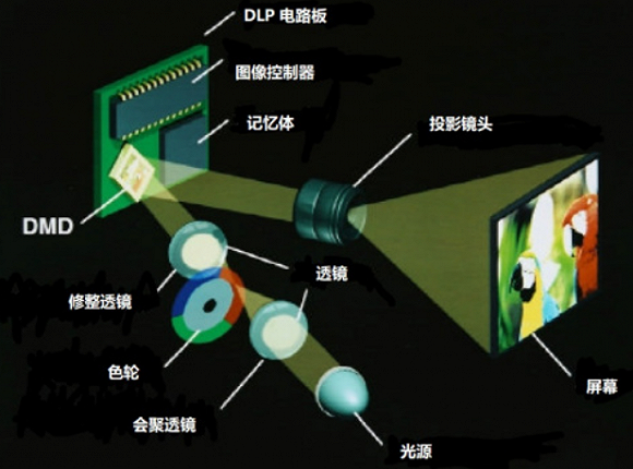 DMD芯片是在硅基片上布置一个由微镜片(精密、微型的反射镜)所组成的矩阵,每一个微镜片控制投影画面中的一个像素,微镜片的数量对应的就是投影画面的分辨率,如800×600、1024×768、1280×720和1920 x 1080(HDTV)等。