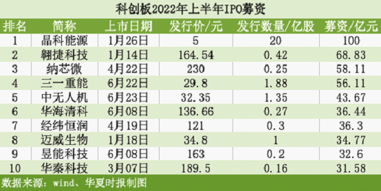 时间再拉近来看,以今年上半年作为标尺对照,科创板募资前三甲为晶科能源(16.590,-0.38,-2.24%)、翱捷科技(70.940,0.54,0.77%)以及纳芯微(356.480,1.99,0.56%),募资金额分别为100亿元、68.83亿元、58.11亿元。