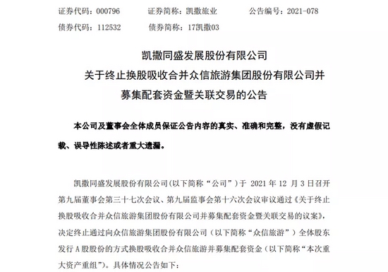 不过,记者还注意到,在发布合并终止的公告同时,凯撒旅业还发布了关于对深交所重组问询函的回复公告。凯撒旅业称,收到《问询函》后,本次交易双方及中介机构对《问询函》中涉及与本次交易方案相关的问询进行了逐项研究推进,对《问询函》中非与本次交易方案相关,涉及海航旅游集团有限公司及其推荐董事对本次交易意见的问询,公司结合方案的逐步细化,持续就交易方案、整合思路、未来发展设想等与海航旅游集团有限公司及其推荐董事通过书面和面对面的形式进行沟通,海航旅游集团有及其推荐董事正在对本次交易进行论证研究。