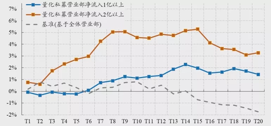 由此来看,量化私募营业部净流入金额2亿以上样本的正向超额收益要更优。