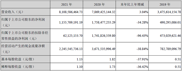 4月13日,蓝帆医疗发布的2021年年报显示,当年实现营收81.1亿元,同比增长3.04%;实现净利润11.56亿元,同比下降34.28%。扣非净利润6213万元,大幅下滑96.43%。