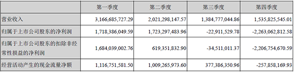 然而,下半年业绩突然变脸,第三季度营收13.85亿元,净利亏损2291万元;第四季度营收15.36亿元,净利亏损22.63亿元,下半年净亏22.86亿元。