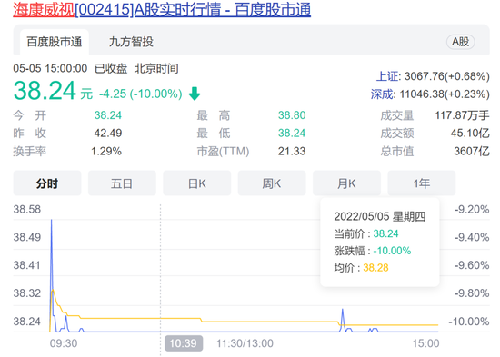 5月5日海康威视跌停开盘,早盘公司曾一度打开跌停,不过之后再度封死跌停。截至收盘,海康威视报跌停价38.24元/股,总市值为3607亿元。