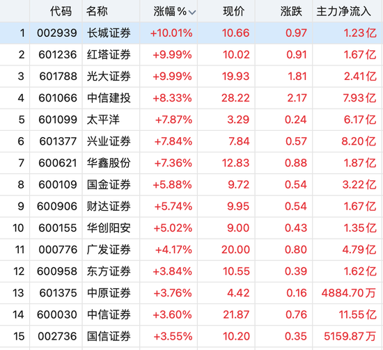 盘面上,证券板块领涨两市,尾盘突现跳水,长城证券(11.680,1.02,9.57%)、红塔证券(9.730,-0.29,-2.89%)、光大证券(21.000,1.07,5.37%)(维权)涨停;保险板块随证券板块上扬,保险巨头中国人寿(28.850,0.00,0.00%)罕见涨停,新华保险(32.060,-0.19,-0.59%)、中国人保(5.300,-0.06,-1.12%)、中国太保(23.370,-0.03,-0.13%)等多股涨超5%;港股新东方在线涨超54%,A股教育板块涨幅亦居前,豆神教育(4.600,0.33,7.73%)、昂立教育(10.940,0.52,4.99%)涨停,凯文教育(4.520,0.02,0.44%)、全通教育(5.300,0.08,1.53%)、行动教育(28.700,-0.33,-1.14%)等多股涨超5%;油气开采及服务全天领跌,蓝焰控股(12.120,-0.07,-0.57%)、通源石油(5.500,-0.11,-1.96%)、新潮能源(3.010,-0.08,-2.59%)(维权)跌超5%;特力A(30.000,0.46,1.56%)今日再度涨停,收获15天11板;海汽集团(37.420,1.09,3.00%)午后涨停,一度走出14天13板,尾盘炸板。