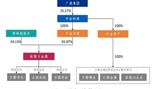 一是,由鲁方金属吸收合并方圆有色、方泰回收和方圆科技成为新鲁方金属,作为中金岭南的重要铜冶炼平台。中金岭南拟出资29.99亿元,取得新鲁方金属约65.87%股权,剩余股权由转股债权人直接或间接持有;
