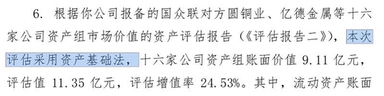 而国众联对方圆铜业等其他16家公司的评估报告,采用资产基础法,十六家公司资产组账面价值9.11亿元,评估值11.35亿元,评估增值率24.53%。