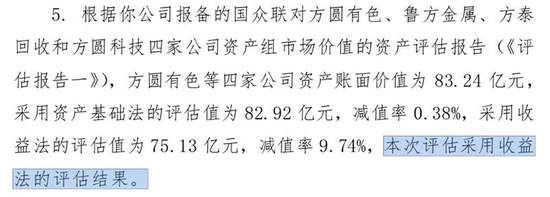 根据中金岭南报备国众联评估报告,方圆有色等4家公司的资产账面价值为83.24亿元,采用资产基础法的评估值为82.92亿元,减值率0.38%;采用收益法的评估值为75.13亿元,减值率9.74%。本次评估采用收益法的评估结果。