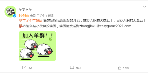 由于游戏火爆程度超预期,目前《羊了个羊》官方已经开始急召后端服务器开发。官方称“推荐入职的奖励五千,自荐入职的奖金五千”。