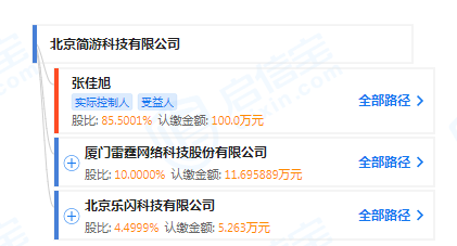 启信宝数据显示,《羊了个羊》关联公司北京简游科技有限公司由张佳旭、厦门雷霆网络科技股份有限公司、北京乐闪科技有限公司共同持股。