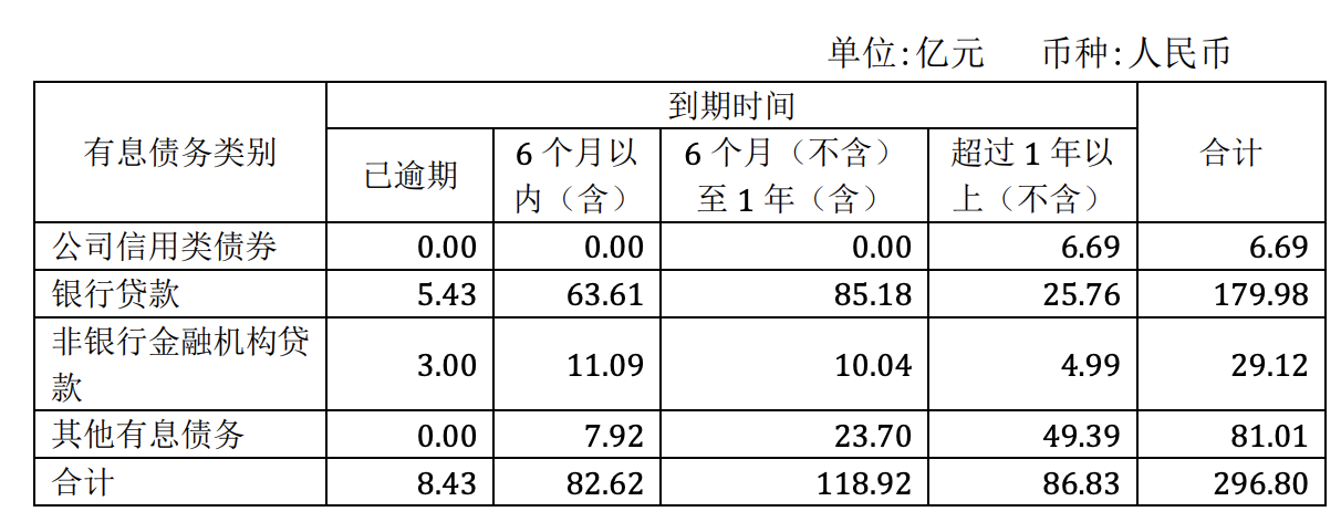 截至2022年6月30日,云南水务合并表范围内有息债务中,信用类债券余额6.69亿元,占有息债务余额的2.25%,其中2022年下半年到期或回售的信用类债券0亿元;银行贷款余额179.98亿元,占有息债务余额的60.64%;非银行金融机构贷款29.12亿元,占有息债务余额的9.81%;其他有息债务余额81.01亿元,占有息债务余额的27.3%。