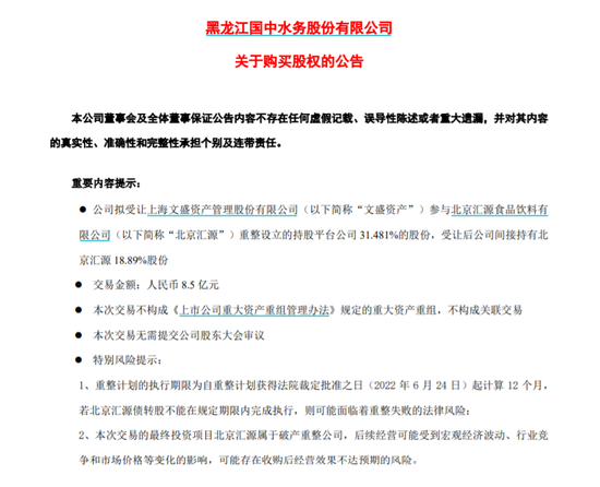 12月26日晚,国中水务公告称,公司拟受让文盛资产参与重整设立的持股平台公司31.481%的股份,受让后公司间接持有北京汇源18.89%股份,交易金额为8.5亿元。