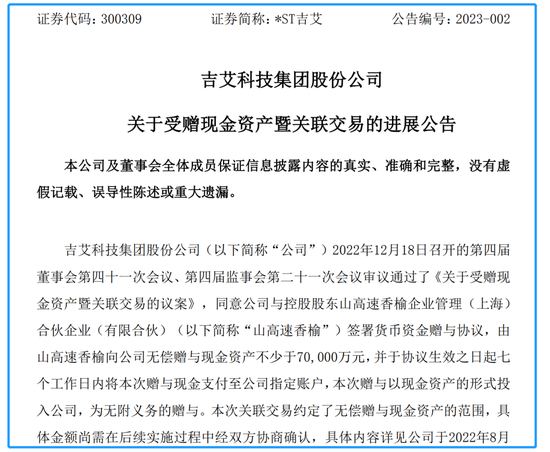 *ST吉艾是在去年12月19日晚披露的这则“馅饼公告”。当时,控股股东拟无偿捐赠不少于7亿元资金,并将于协议生效之日起七个工作日内现金支付至公司指定账户,这意味着这笔钱年内就能到账。此外,这笔钱也没有其他附加条件,赠与以现金资产的形式投入公司,为无附义务的赠与。