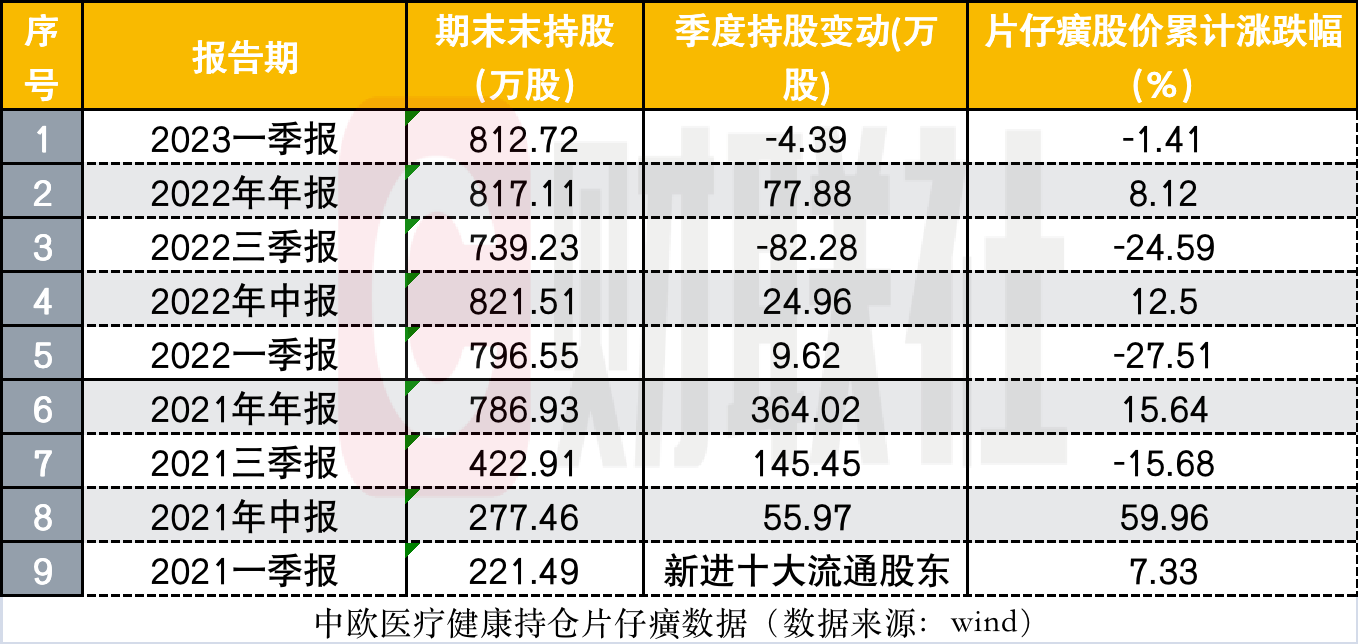 至此,片仔癀的前十大流通股东已经连续3个季度,仅有中欧基金1家公募的身影。