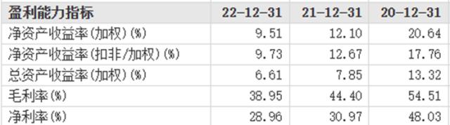 2020年-2022年,联美控股净资产收益率(加权)分别为20.64%、12.10%以及9.51%;总资产收益率(加权)分别为13.32%、7.85以及6.61%;毛利率分别为54.51%、44.40%以及38.95%;净利率分别为48.03%、30.97%以及28.96%。