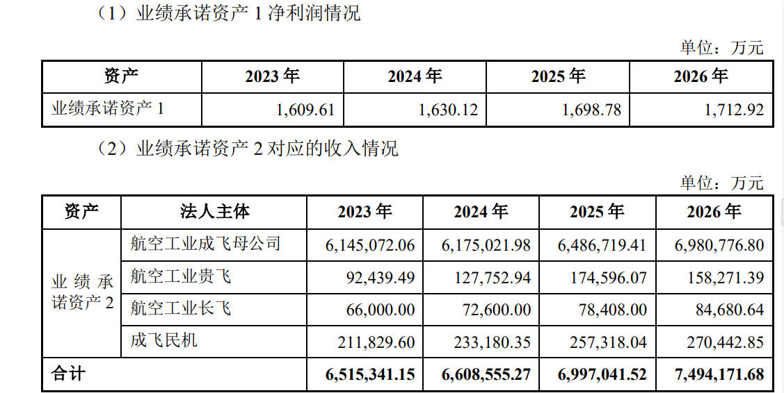 《每日经济新闻》记者注意到,业绩承诺主要涉及两部分资产。其中,成飞航产为业绩承诺资产1,成飞集团母公司本身、航空工业贵飞、航空工业长飞、成飞民机为业绩承诺资产2。