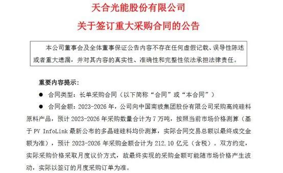 天合光能13日晚间公告,公司与南玻A(7.600,0.69,9.99%)签订高纯硅料长单采购合同,预计2023-2026年采购金额合计达212.1亿元(含税)。