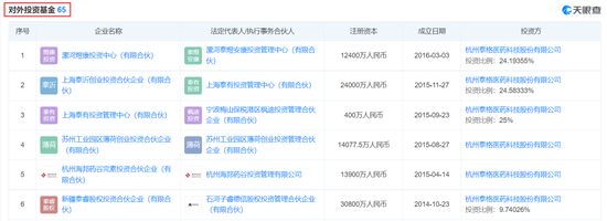 其中,最为活跃的是泰格医药。天眼查显示,泰格医药对外投资了65支基金,不乏启明创投、盈科资本、云锋基金、君联资本、毅达资本、博远资本、薄荷天使基金、汉康资本、幂方资本、华盖资本等知名机构。