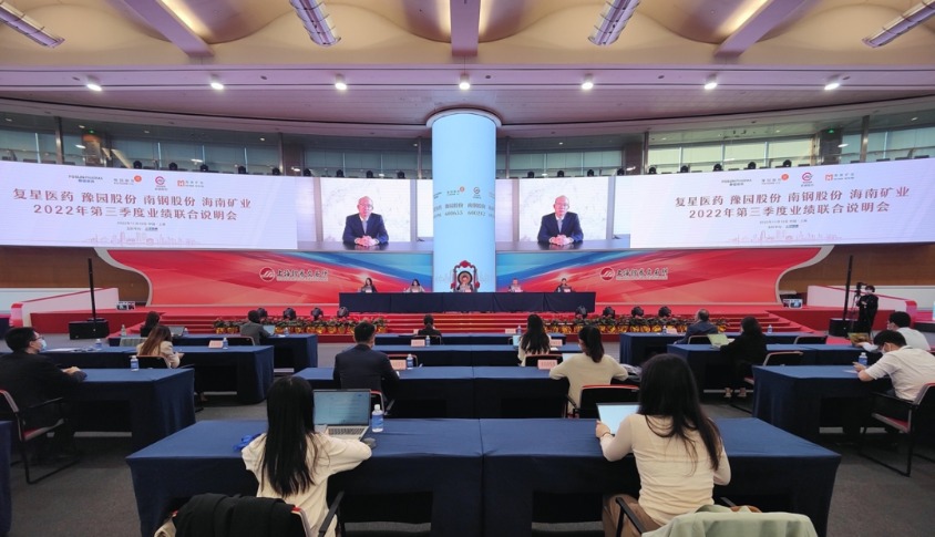 ▲复星医药、豫园股份、南钢股份、海南矿业2022年第三季度业绩联合说明会现场(图片源自复星集团)