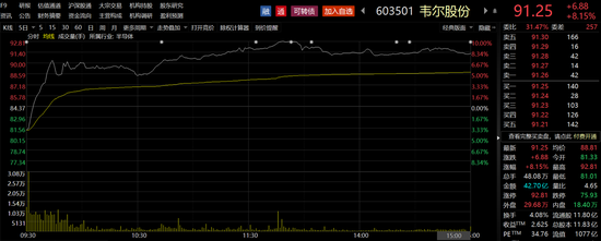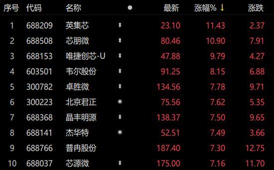 韦尔股份的低开高走,更为半导体板块注入了强心针——今日,半导体板块集体走高,英集芯(23.100,2.37,11.43%)、芯朋微(80.460,7.91,10.90%)、唯捷创芯(47.880,4.27,9.79%)、卓胜微(134.560,9.71,7.78%)、北京君正(75.560,5.35,7.62%)、晶丰明源(138.370,9.65,7.50%)等多股一同大涨。