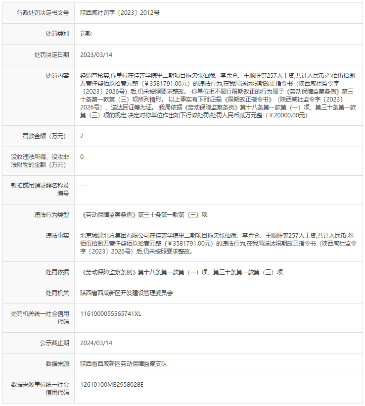 北京城建北方集团有限公司因拖欠工资拒不整改被罚