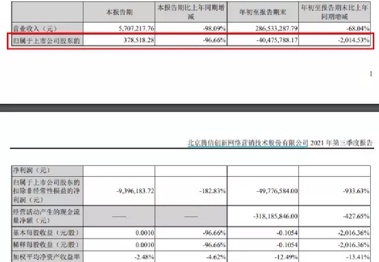 腾信股份去年年报显示,公司2020年实现营业总收入8.9亿,同比下降39.8%;实现归母净利润-1.1亿,上年同期为3426.3万元,未能维持盈利状态,此前两年的盈利甚至抵不上公司2020年一年的亏损。