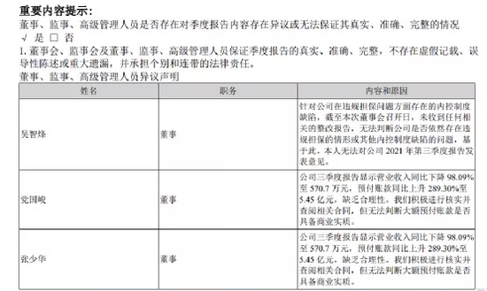 董事吴智烽弃权的理由:针对公司在违规担保问题方面存在的内控制度缺陷,截至本次董事会召开日,未收到任何相关的整改报告,无法判断公司是否依然存在违规担保的情形或其他内控制度缺陷的问题,基于此,本人无法对公司2021年第三季度报告发表意见。
