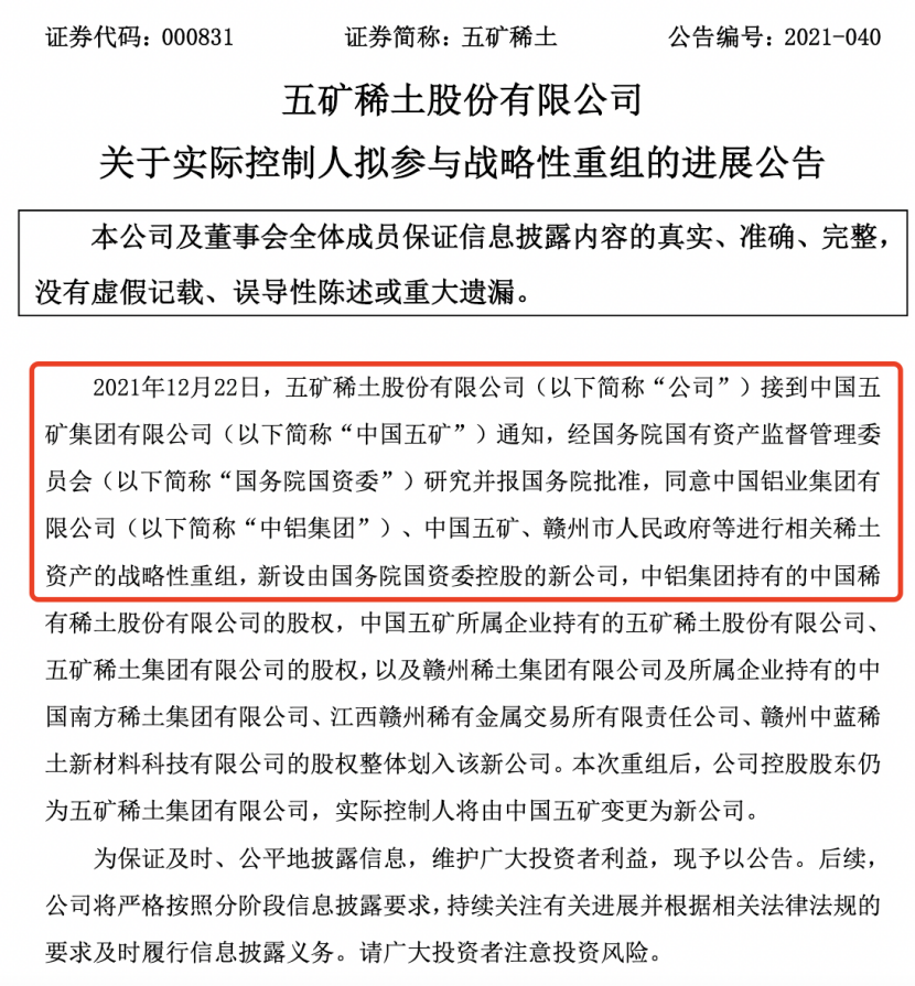 12月22日晚间,五矿稀土(47.470,2.49,5.54%)公告,经国务院国资委研究并报国务院批准,同意中国铝业(6.730,0.55,8.90%)集团有限公司、中国五矿、赣州市人民政府等进行相关稀土资产的战略性重组。重组完成后,五矿稀土的实控人将变更为国务院国资委控股的新公司。