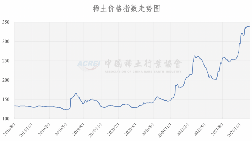 中国稀土行业协会监测的数据显示,截至12月22日,稀土价格指数为337.8点,较去年5月初的129.5点,累计涨幅已超过160%。