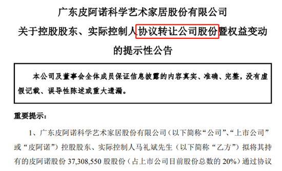 根据公告,由于皮阿诺控股股东、实际控制人马礼斌担任上市公司董事长、总经理,根据相关规定,马礼斌2022年度最多可转让其所持上市公司股份的25%,即不超过2383万股,2023年才可转让剩余约定的股份。因此,股份转让将分两次完成,2022年转让2378万股(占总股本的12.75%),2023年转让1352万股(占总股本的7.25%)。