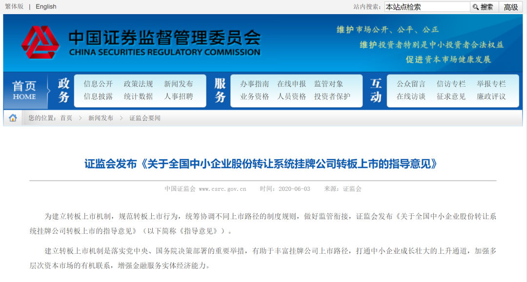 6月3日晚间,为建立转板上市机制,规范转板上市行为,统筹协调不同上市路径的制度规则,做好监管衔接,证监会发布《关于全国中小企业股份转让系统挂牌公司转板上市的指导意见》(下称《指导意见》)。