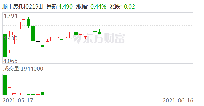 然而上市首日开盘,顺丰房托报4.49港元,跌破4.98港元的发行价。截至目前,顺丰房托股价4.49港元,仍旧跌破发行价,最新市值为35.9亿港元。
