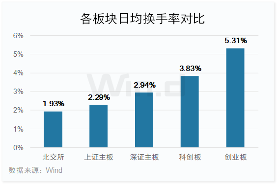 2022年一季度创业板每日平均换手率为5.31%,高于沪深主板、科创板同期平均换手率。涨跌停20%制度叠加投资者众多,使得创业板成交最活跃。