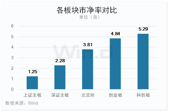 创业板最新市净率为4.84倍,低于科创板,高于沪深主板。