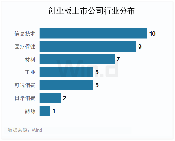 2022年一季度创业板发行的39家公司主要分布在7个Wind一级行业中,其中信息技术行业发行10家居首,另外医疗保健和材料行业排名也靠前,挂牌数分别为9家和7家,工业和可选消费行业发行数量均为5家。