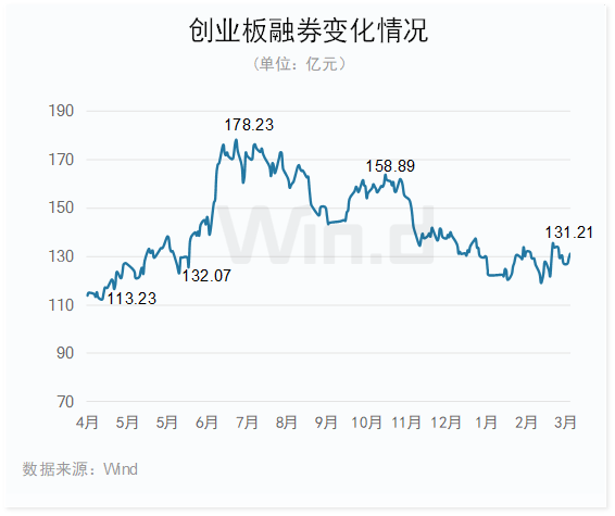 截止2022年3月30日,创业板融券余额为131.21亿元,较2021年7月22日历史高位178.23亿下降26.38%。