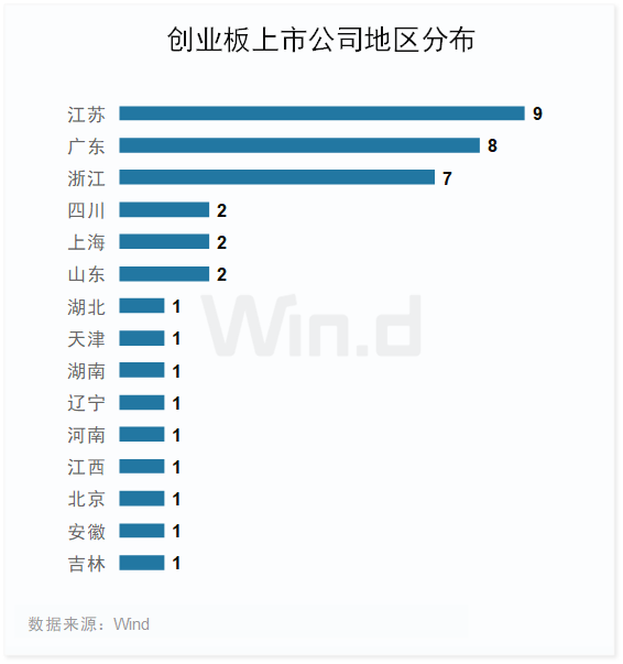 2022年一季度发行的创业板公司主要集中在江苏、广东、浙江,分别有9家、8家、7家。四川、上海、山东均有2家,其余湖北、天津等9个地区均仅有1家。