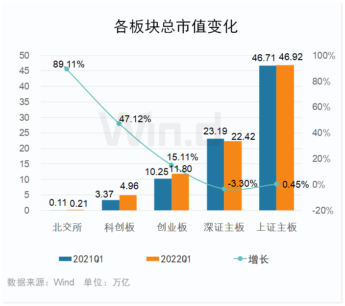 新股上市叠加行情调整,各板块总市值涨跌不一,截至2022年3月31日收盘,创业板总市值达11.80万亿元,较2021年3月31日总市值10.25万亿元上升1.55万亿,市值增长15.11%,低于科创板和北交所,但大幅高于沪深主板。