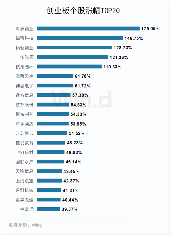 剔除新股上市首日巨大涨幅后,2022年一季度创业板个股跌多涨少。其中涨幅超过100%有5只,海辰药业(55.430,0.42,0.76%)涨幅175.05%居首。