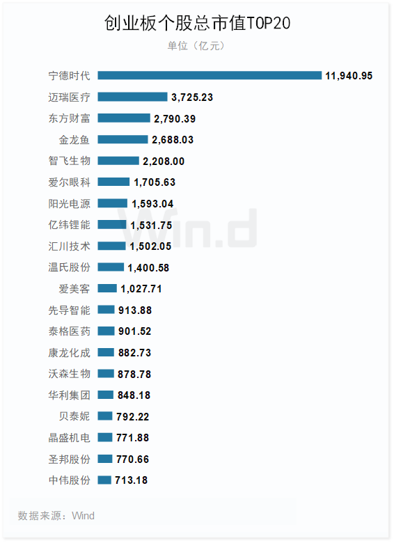 宁德时代(518.900,6.60,1.29%)遥遥领先,目前位列A股市值第五,达1.19万亿。次于主板的贵州茅台(1780.010,61.01,3.55%)、工商银行(4.790,0.02,0.42%)、建设银行(6.300,0.01,0.16%)和招商银行(47.100,0.30,0.64%)。此外迈瑞医疗(305.960,-1.29,-0.42%)、东方财富(26.090,0.75,2.96%)、金龙鱼(50.100,0.52,1.05%)等10家市值超千亿。