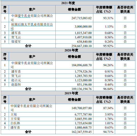 需要指出的是,骑士乳业还存在大客户依赖的问题。2019-2021年,骑士乳业牧业板块来自中国蒙牛乳业有限公司所属公司的收入占公司牧业板块收入的87.34%、94.26%、93.31%,销售金额分别为1.5亿元、1.8亿元、2.5亿元,主要销售产品为生鲜乳。同时,公司糖业板块报告期内对浙江杭实善成实业有限公司销售额占糖业板块总收入的40.76%、36.91%、44.39%。对于前述情况,北交所要求骑士乳业说明公司与蒙牛乳业合作的稳定性,是否存在被替代的风险以及与杭实善成交易的真实性。(蓝鲸上市公司 王晓楠 wangxiaonan@lanjinger.com)