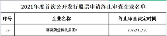 据证监会官网消息,证监会对发行监管部首次公开发行股票审核工作流程及申请企业情况予以公示。赛灵药业科技集团位列2021年度首次公开发行股票申请终止审查企业名单,终止审查决定时间为2022年10月28日。