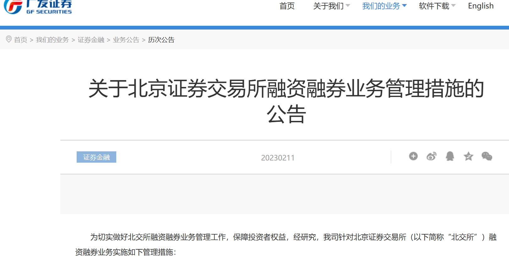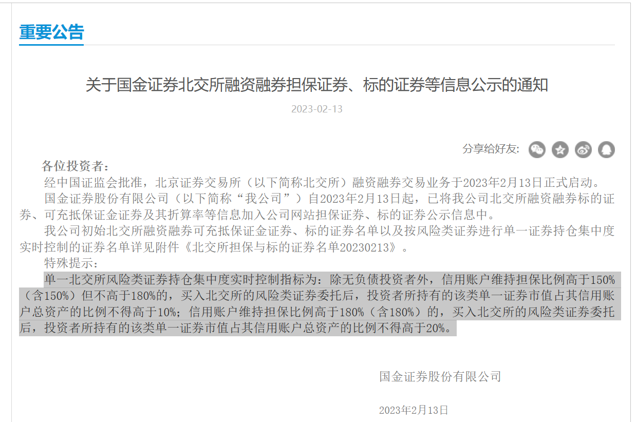 2月13日,国金证券在官网上发布了《关于国金证券北交所融资融券担保证券、标的证券等信息公示的通知》。其中特别提示: