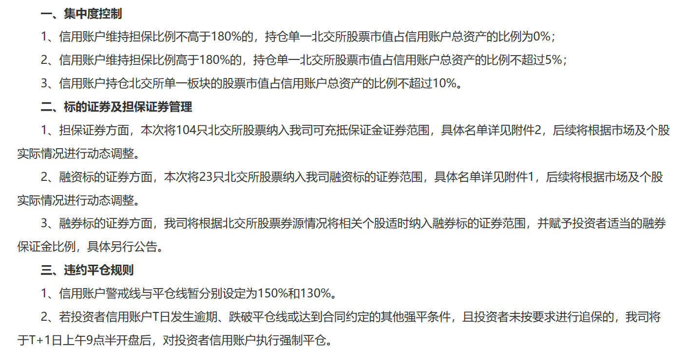 广发证券(16.660,-0.11,-0.66%)也在官网上发布了《关于北京证券交易所融资融券业务管理措施的公告》。其中在集中度控制方面,公司做了以下三条规定: